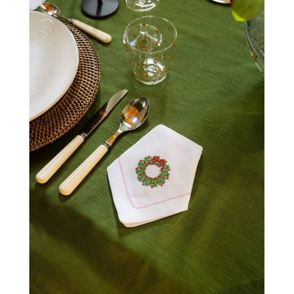 El işçiliğiyle işlenmiş kırmızı kurdeleli yeşil yaprak çelenk deseni, beyaz kumaş üzerinde geleneksel yılbaşı ruhunu modern bir incelikle yansıtır.