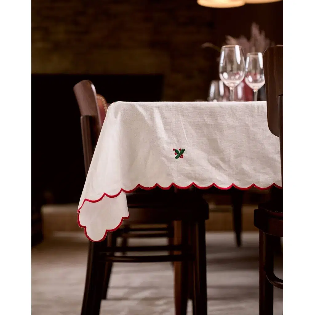 El işçiliğiyle işlenmiş kırmızı ve yeşil çobanpüskülü (mistletoe) motifleri, beyaz zemin üzerinde sade ama etkileyici bir görünüm sunar.