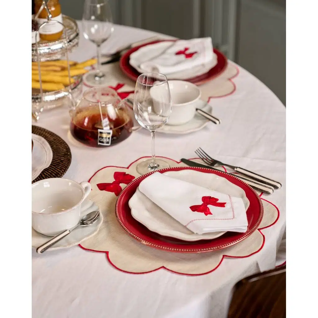 Beyaz zemin üzerine işlenmiş kırmızı kurdele nakışı, sade bir tasarıma sıcaklık ve kutlama ruhu katar. El işçiliğini yansıtan zarif dikiş detayları, sofranıza incelikle hazırlanmış bir dokunuş kazandırır.