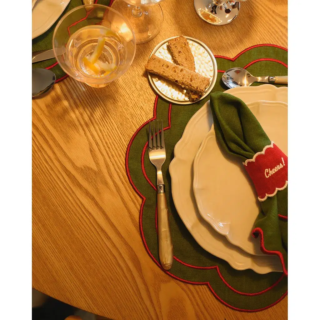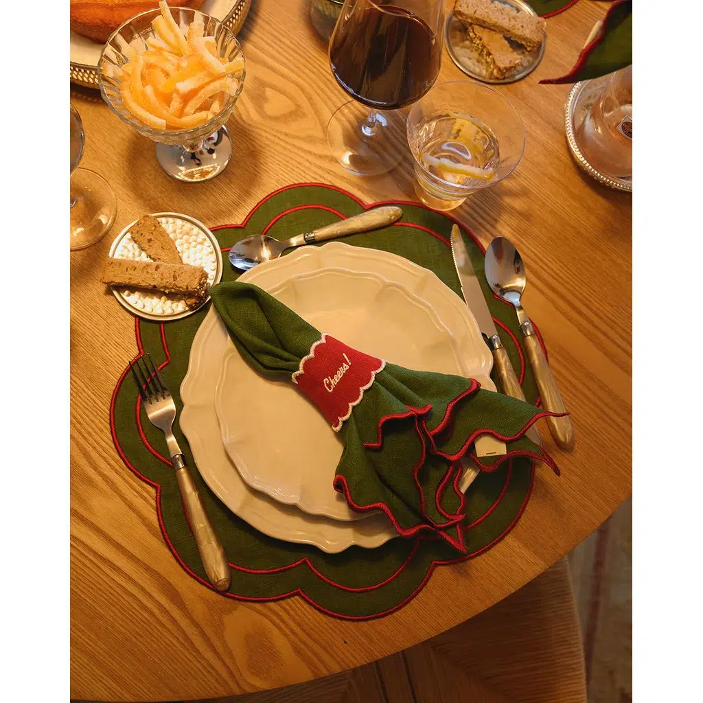 Zeytin yeşili zemin üzerine kırmızı kenar detayıyla, rustik bir sıcaklık ve modern bir şıklık sunar.