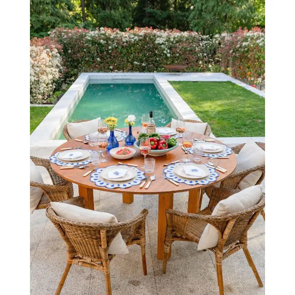 Gotas seti, bejin doğallığıyla mavinin serinliğini buluşturan zarif bir masa tekstili deneyimi sunar. Dalga formundan ilham alan kıvrımlı kenar detayı ve modern tasarımı ile hem çağdaş hem de huzurlu bir sofra görünümü yaratır.