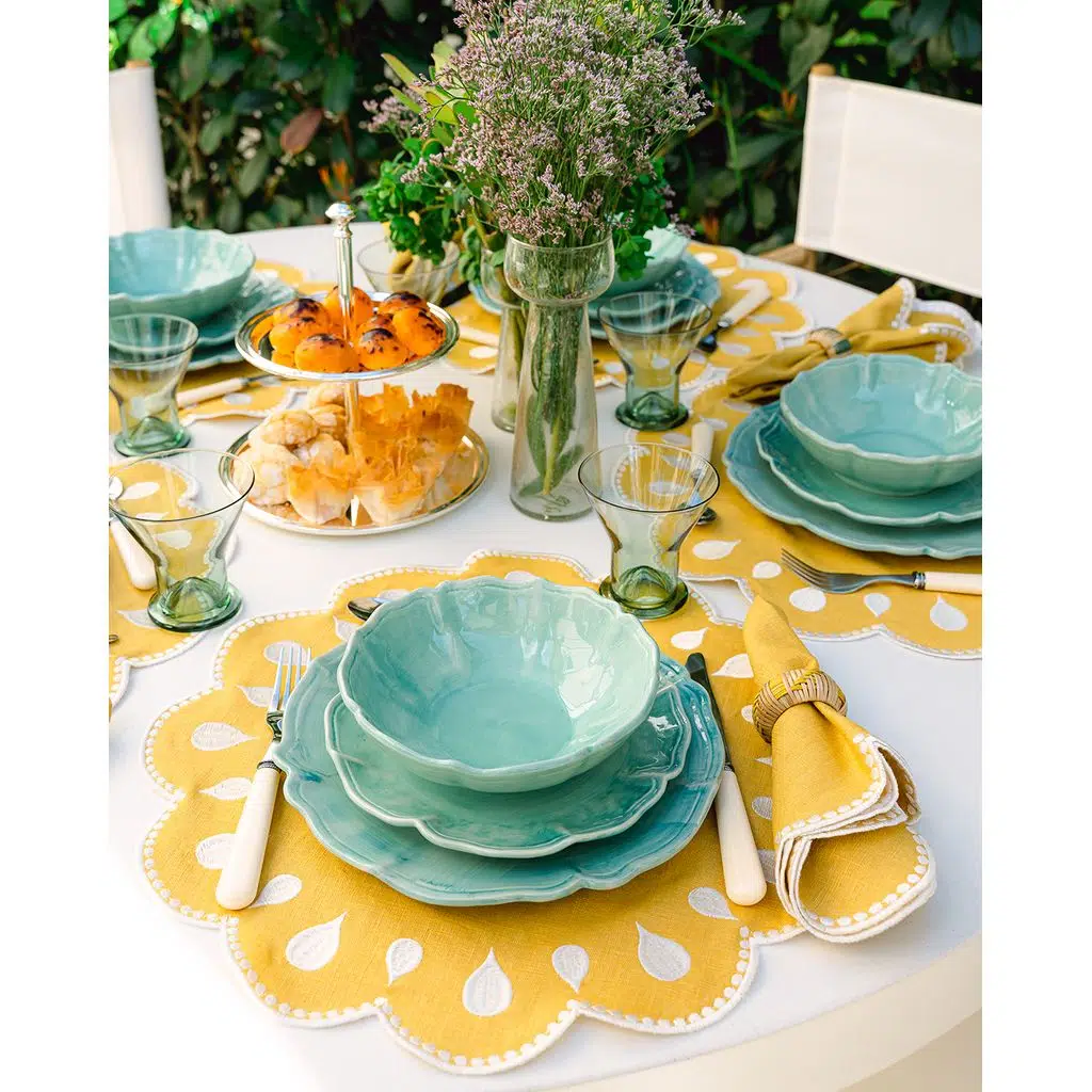 Gotas Koleksiyonu’nun sarı ve beyaz tonlu bu zarif seti, enerjisi yüksek, neşeli sofralar kurmak isteyenler için tasarlandı. Sarı amerikan servis, beyaz peçeteyle taze ve dengeli bir görünüm sunarken, kıvrımlı kenar formu tasarıma zarif bir dinamizm kazandırıyor.