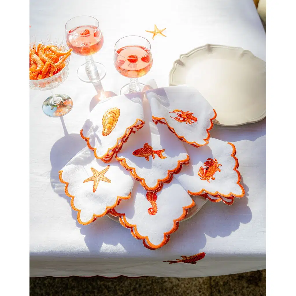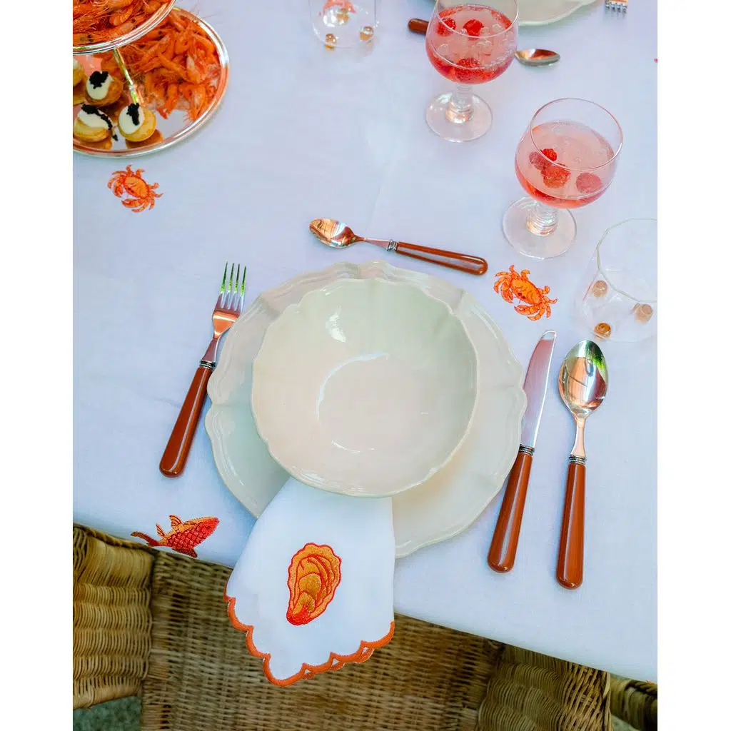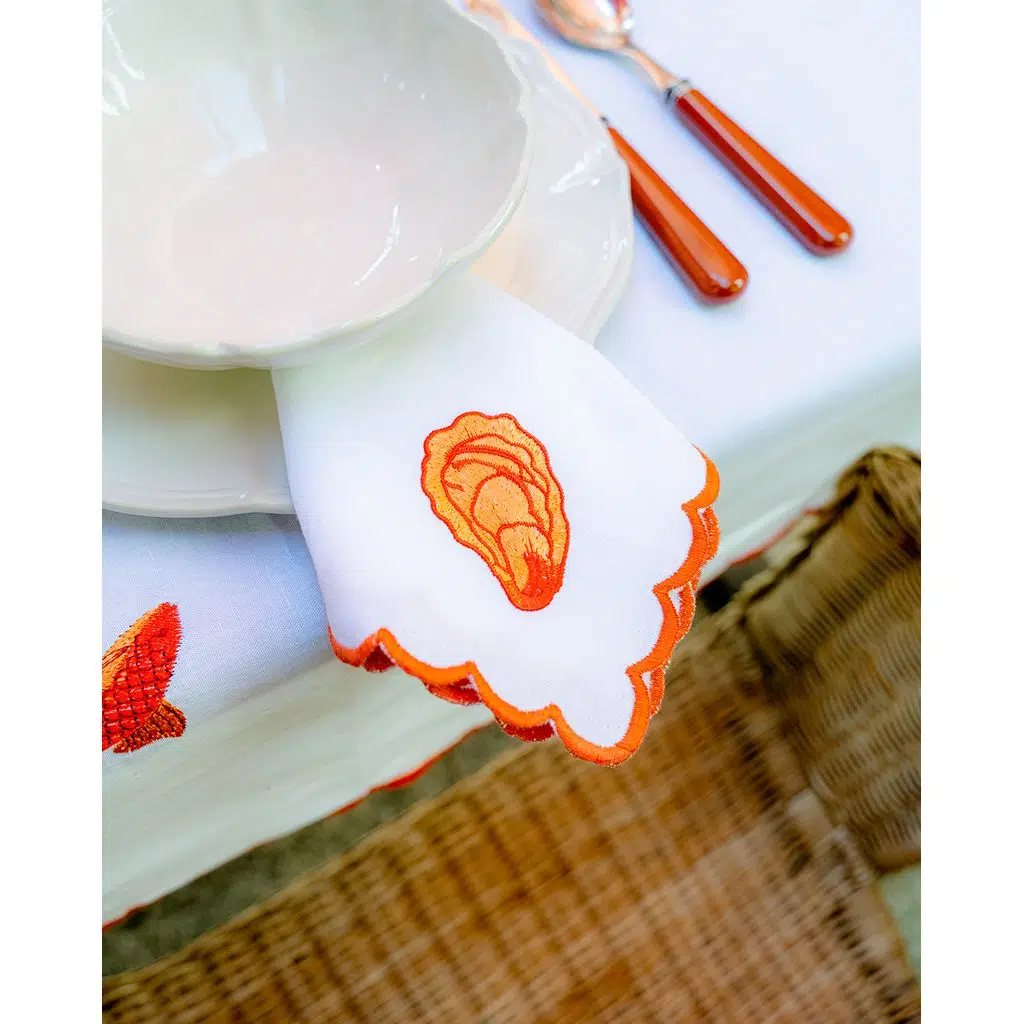 Beyaz keten ve pamuk karışımı kumaş üzerine uygulanan turuncu biyeler ve zarif istiridye nakışıyla tasarlanan İstiridye Peçete, sofralarınıza denizden ilham alan şık bir dokunuş kazandırır. Turuncu tonun canlı enerjisi, yaz sofralarına dinamizm katarken, el işçiliğiyle hazırlanmış detaylar davetlerinize zarafet katar. Sahil temalı akşam yemekleri, yaz kutlamaları ve özel davetler için ideal bir seçimdir.