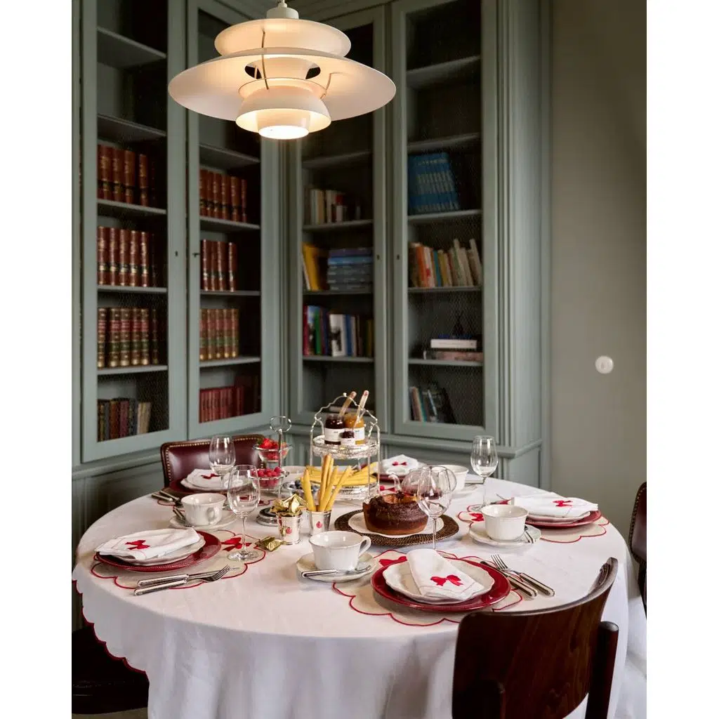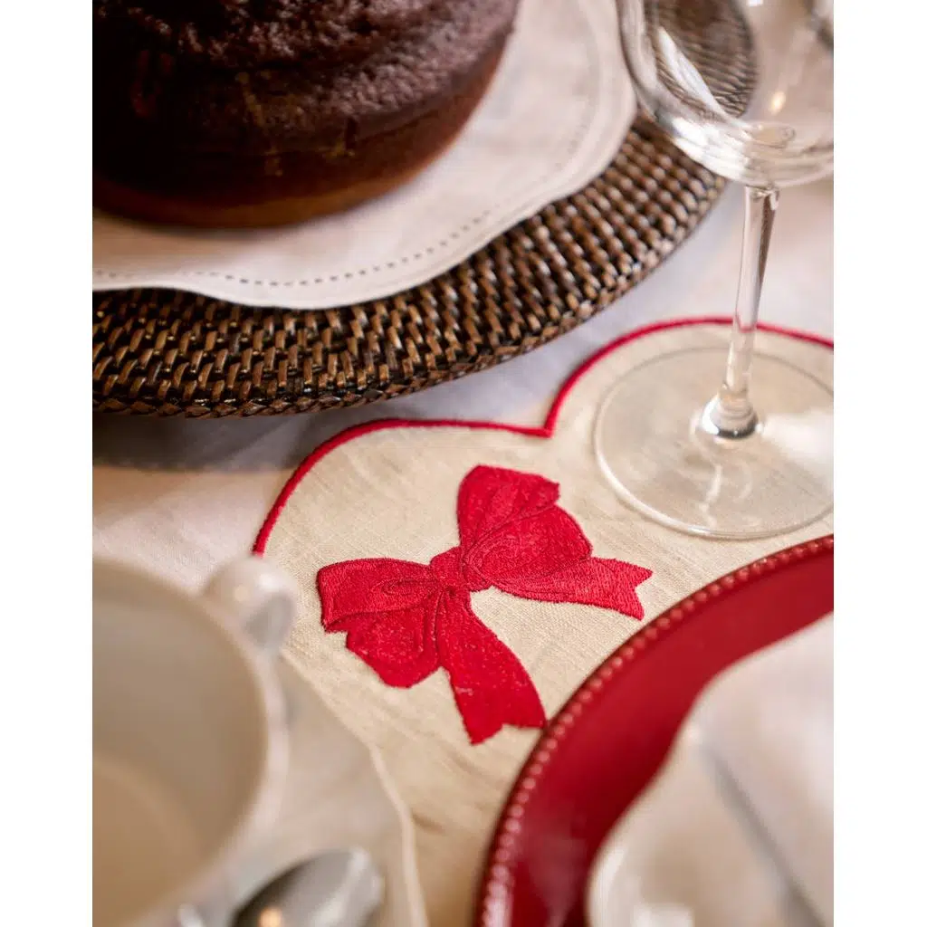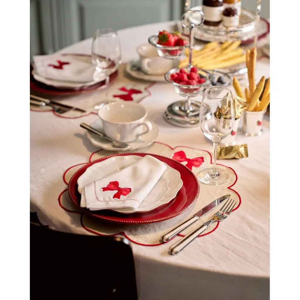 Bej zemin, kırmızı nakış ve biye detayıyla birleşerek sade ama dikkat çekici bir kontrast yaratır. Yuvarlak formu sayesinde klasik ve modern masa düzenlerinde kolaylıkla kullanılır; özellikle yılbaşı ve özel kutlama sofralarında sıcak bir atmosfer oluşturur.