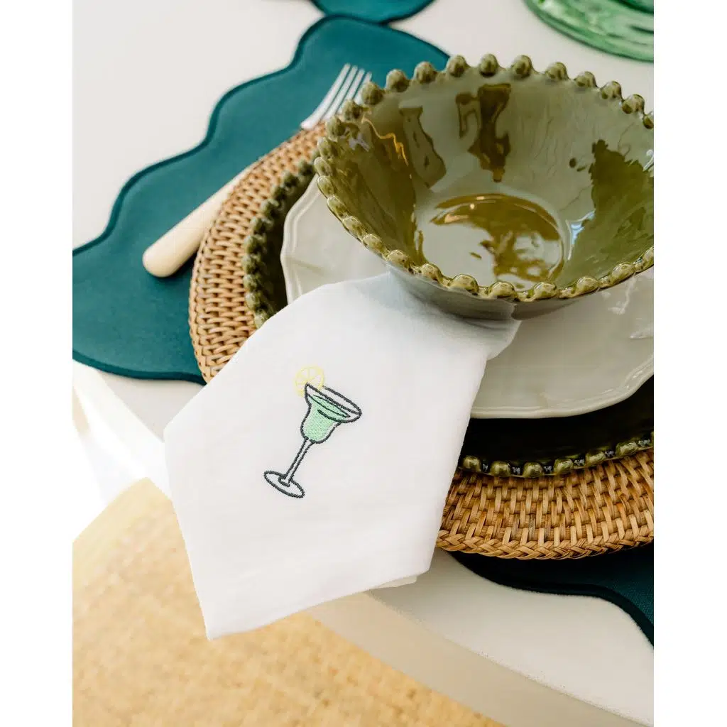 Keten ve pamuk karışımı doğal dokusuyla öne çıkan Margarita Peçete, zarif margarita kadehi nakışıyla sofralarınıza neşeli ve samimi bir atmosfer katar. Yaz akşamları, bahçe partileri veya keyifli dost buluşmaları için tasarlanan bu özel peçete; hem gündelik hem de özel davet sofralarında şıklığı ve rahatlığı bir arada sunar.