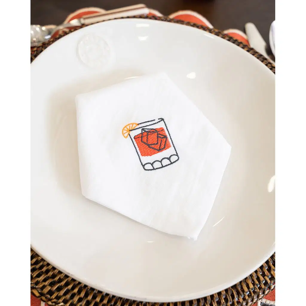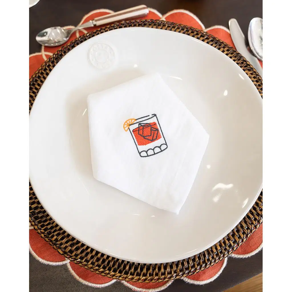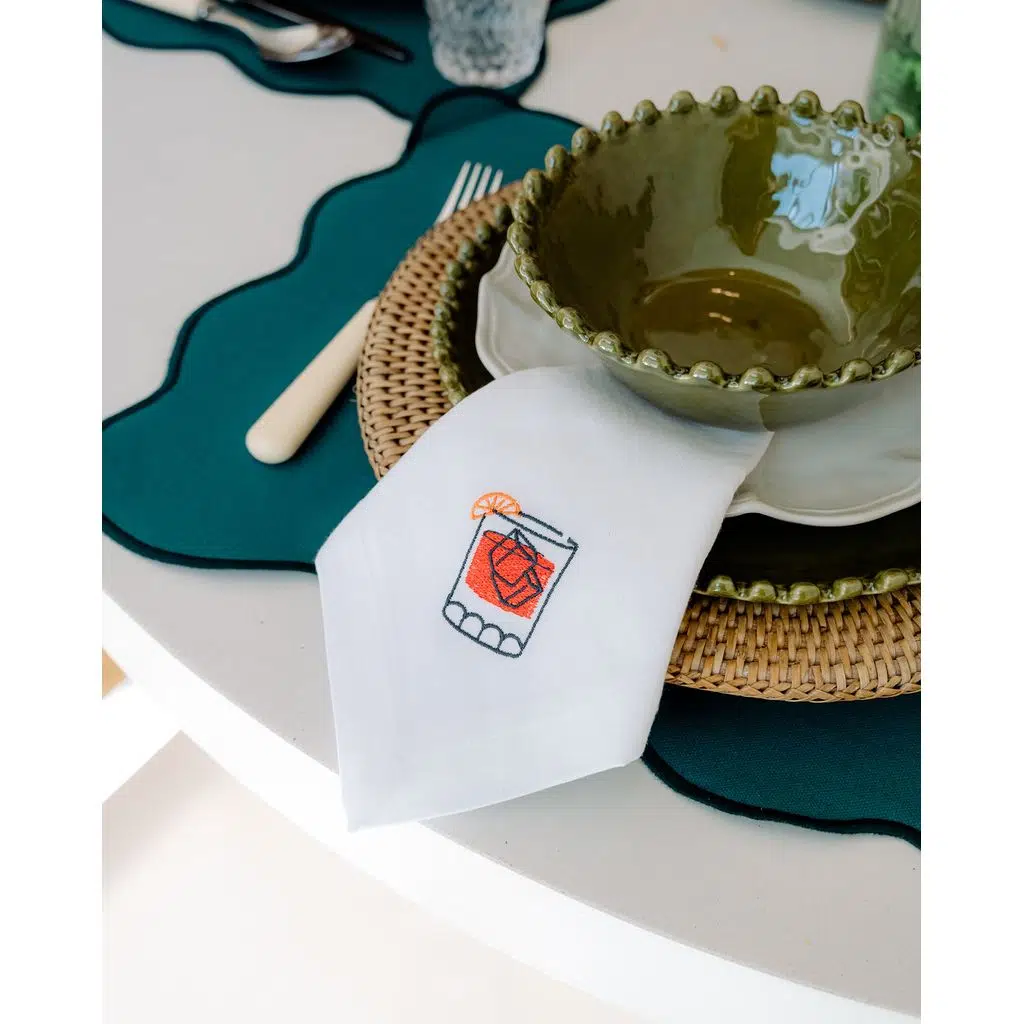 Keten ve pamuk karışımının zarif dokusuyla üretilen Negroni Peçete, ikonik negroni kadehi nakışıyla sofralarınıza sofistike bir dokunuş katar. Renkli detayları ve modern tasarımıyla hem gündelik kullanıma hem de özel davetlere uyum sağlar. Özellikle kokteyl temalı yemekler ve şık akşam sofraları için mükemmel bir seçimdir.