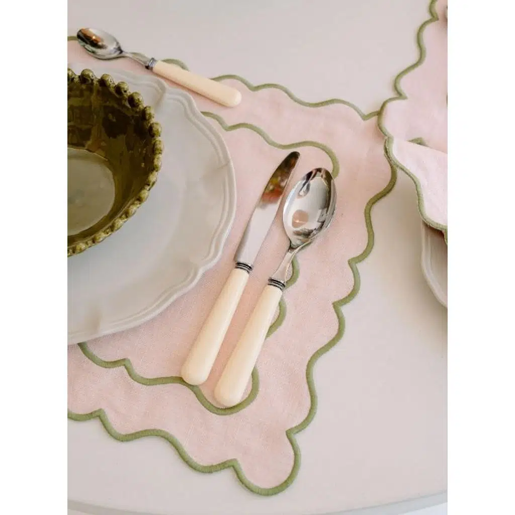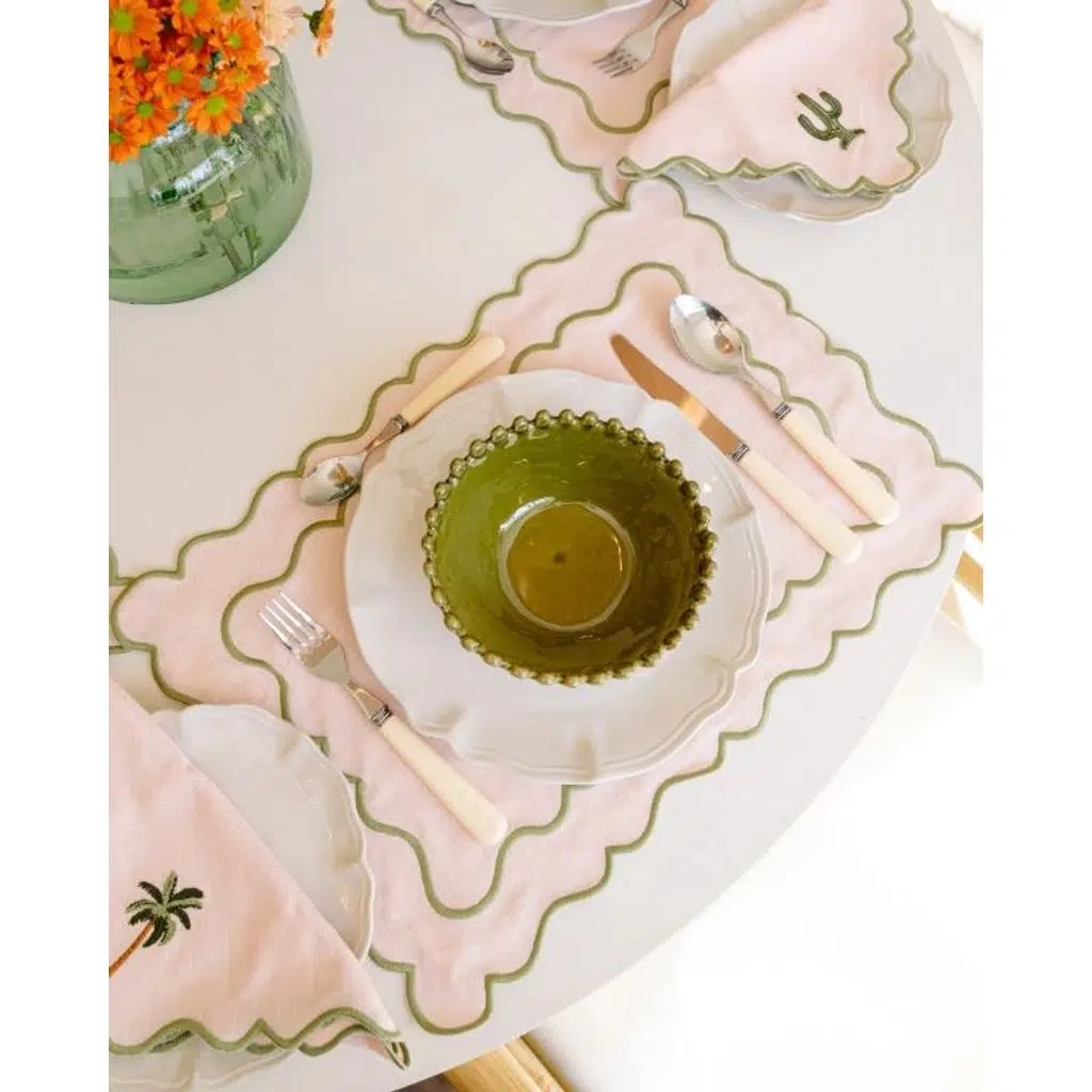 Sofranızda yumuşak ama dikkat çekici bir şıklık yaratmak istiyorsanız, Ondulado Amerikan Servis tam size göre. Pudra pembe ve yeşil tonlarının zarif uyumu, masanıza hem tazelik hem de sofistike bir hava katıyor. Keten ve pamuk karışımı doğal dokusuyla günlük kullanıma olduğu kadar özel davet sofralarına da uygundur.
