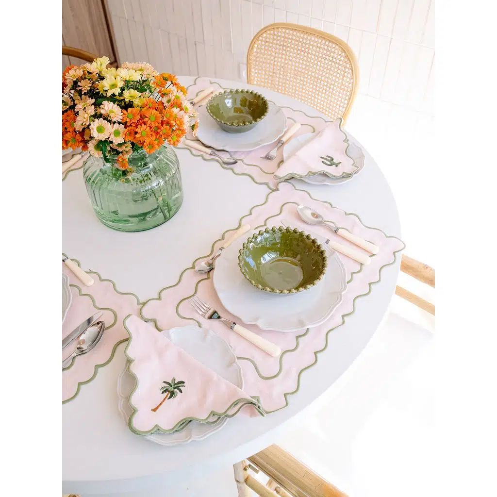 Doğanın ilham veren simgelerinden biri olan palmiye motifi, açık pembe zeminle birleşerek bu özel Ondulado setine yazın huzurunu ve romantizmini taşıyor. Dalgalı (ondulado) kenar detayı sayesinde klasik masa örtüsü çizgisinin dışına çıkarken, yumuşak renk geçişleriyle hem göz alıcı hem de dinlendirici bir ambiyans sunar.