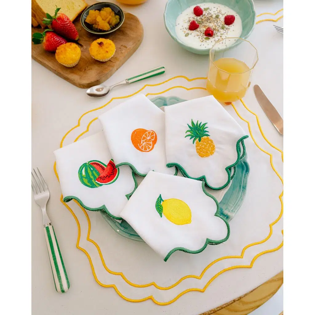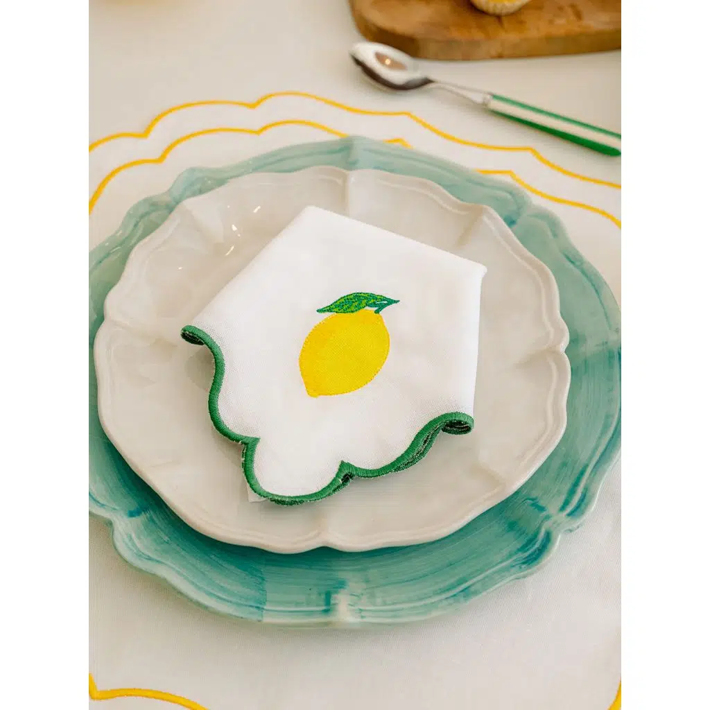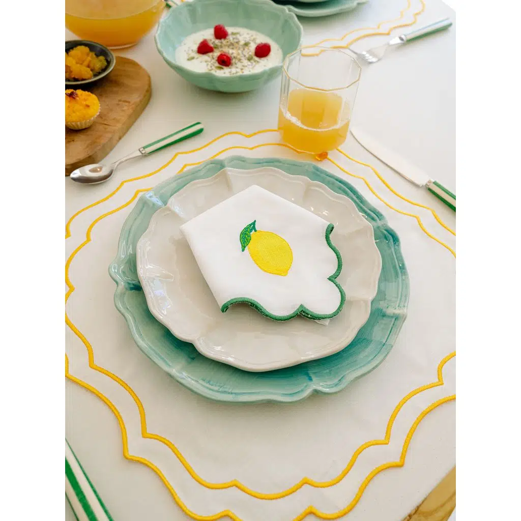 Yaz sofralarınıza taptaze bir enerji katın! Dalgalı kenar tasarımı ve zarif limon nakışıyla öne çıkan Ondulado Peçete, keten ve pamuk karışımının doğal dokusuyla hem şık hem de kullanışlı bir seçimdir. Havuz başı davetlerden açık hava akşam yemeklerine kadar her ortamda sofranıza canlı ve ferah bir atmosfer kazandırır.