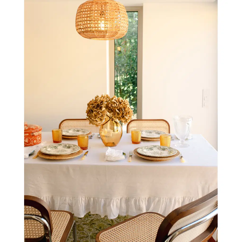 Keten ve pamuk karışımından üretilen beyaz masa örtümüz, zarif fırfır detayıyla sofralarınıza sofistike bir dokunuş katıyor. Pamuk yumuşaklığı ile ketenin dayanıklılığını bir araya getiren bu örtü, konfor ve şıklığı dengeli şekilde sunar. En çok tercih edilen modellerimizden biri olan bu ürün, sade ama etkileyici tasarımıyla öne çıkıyor.