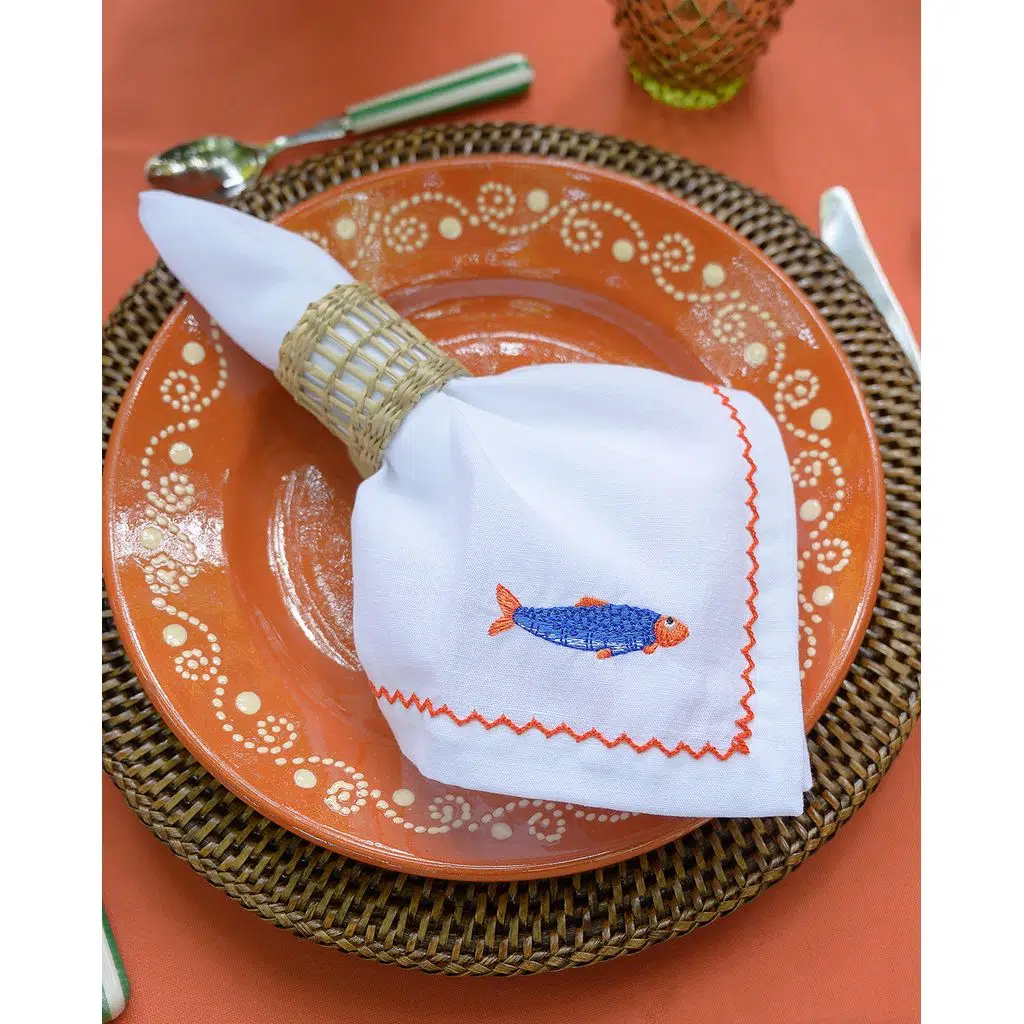 Mavi sardalya nakışı ile süslenen bu keten/pamuk karışımı peçete, Akdeniz ruhunu yansıtan sofralar için ideal bir seçimdir. Deniz temalı davetlerde, balık sofralarında veya yaz akşamı yemeklerinde masanıza hem zarafet hem de neşeli bir detay ekler.