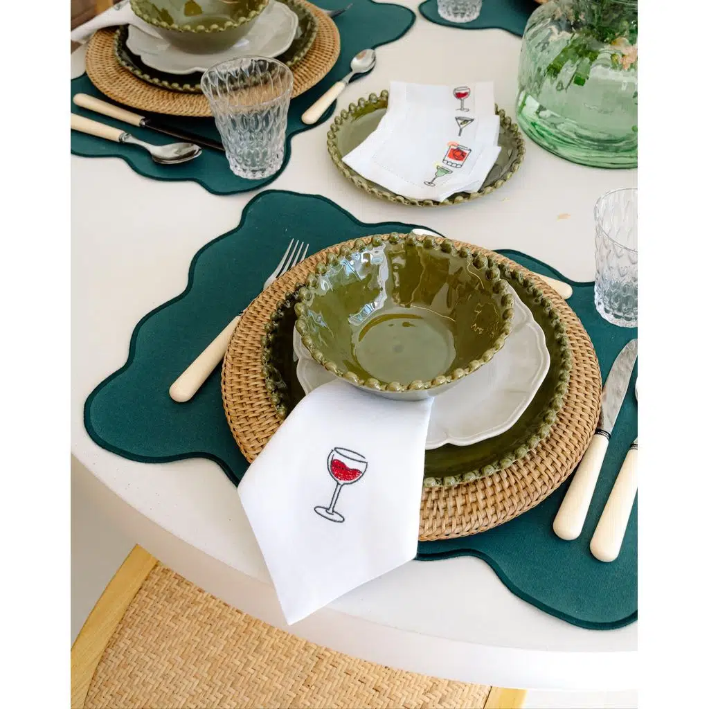 Keten ve pamuk karışımının yumuşak dokusu ile üretilen Wine Peçete, şarap kadehi nakışıyla sofranıza zarafet ve keyif katar. Şık detayları sayesinde romantik akşam yemeklerinden arkadaş davetlerine kadar her ortamda sıcak ve davetkâr bir atmosfer yaratır. Özel günlerde, kutlamalarda ve şarap eşliğinde geçen keyifli sofralarda kusursuz bir tamamlayıcıdır.