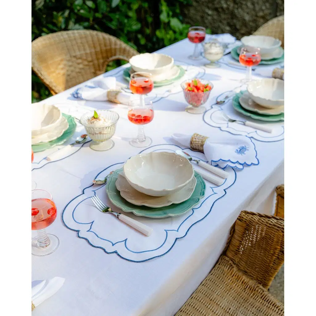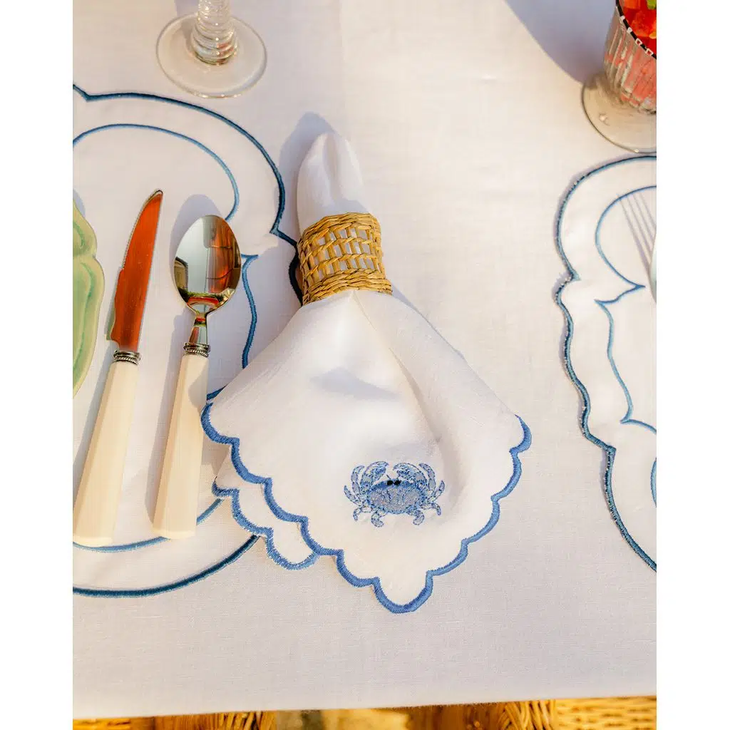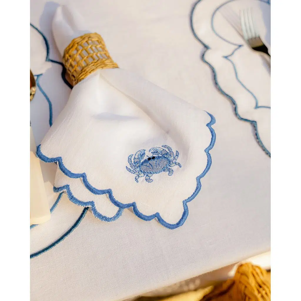 Beyaz keten ve pamuk karışımı kumaş üzerine işlenen zarif mavi yengeç nakışıyla, Yengeç Peçete sofralarınıza deniz esintisi ve ferah bir hava katar. Mavi biyesiyle bütünleşen tasarım, yaz davetlerinden deniz kenarı sofralarına kadar her ortamda zarafet ve tazelik sunar. Doğal dokusu sayesinde hem estetik hem de konforlu bir kullanım sağlar.