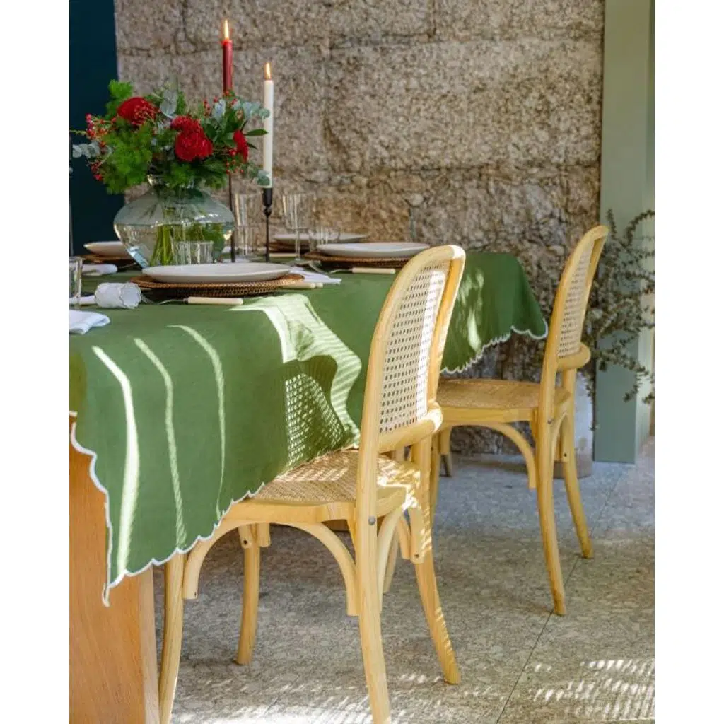 Canlı yeşil tonları ve özenle işlenmiş kesik dikiş detaylarıyla öne çıkan bu masa örtüsü, sofranıza sade ama etkileyici bir şıklık kazandırır. Keten ve pamuk karışımından üretilen kumaşı, hem yumuşak bir dokunuş hem de uzun ömürlü bir kullanım sunar.